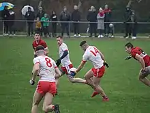 The free-flowing Dingle forwards combined well with points coming from Dylan and Conor Geaney before their cousin, Paul rose highest over Kerry teammate Brian Ó Beaglaoich to gather the ball before finding the bottom corner to give Dingle a 2–4 to 0–1 lead after 18 minutes.