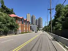 West New York is one of North Hudson's communities atop The Palisades above the Hudson River, and home to the highest point in the county.[33] Its Hudson Waterfront has been known as Bulls Ferry since before the American Revolutionary War. Bergenline Avenue is its main commercial thoroughfare, while the wide two-way 60th Street is a major cross-town thoroughfare, and site of Town Hall. More than half of U.S. Presidents have streets bearing their name in the town.[34]