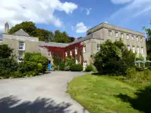 West Ogwell House, the former manor house of West Ogwell, stands next to the church and is a Georgian structure built in 1790 by Pierce Joseph Taylor.[7] In the opinion of Pevsner it has an "overwhelmingly plain exterior (with) no decoration whatever".[8] It incorporates some remains from the former manor house of the Reynell family (whose earliest Devonshire seat was at adjoining East Ogwell),[9] including stables and outbuildings built in 1588 by Thomas Reynell,[10] as the surviving datestone in the wall of the lean-to building in the courtyard attests by its inscription Anno Domini 1588 T. R..[11] In 1943 it became the Convent of the Companions of Jesus the Good Shepherd (founded 1920), and a chapel was added in 1955.[12] In 1996 the Convent moved to Windsor and joined with the Community of St John Baptist,[13][14] and sold West Ogwell to the Gaia House Trust (the then Gaia House being situated at the Old Vicarage in nearby Denbury) whereupon it became the home of a Buddhist centre, which changed the name of the building to "Gaia House", and uses it as "a quiet retreat for meditation and contemplation".[15]
