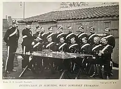 The Imperial Yeomanry were subsumed into the new Territorial Force (TF) under the Haldane Reforms of 1908.[27][28] On 1 April 1908, the regiment was renamed as the West Somerset Yeomanry. The regiment was based at County Territorial Hall in Taunton (since demolished).[4][5][12][29][30] It formed part of the 2nd South Western Mounted Brigade in Southern Command.[12]