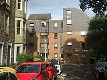 With the union of the Church of Scotland and the United Free Church in 1929, the congregation was allocated a parish closer to the church building. At this point, the congregation disposed of its mission halls in the Old Town.[45][46] On 11 June 1972, the congregation united with Grange Parish Church on Kilgraston Road in the Grange and Warrender Parish Church on Whitehouse Loan in Bruntsfield to form Marchmont St Giles' Parish Church.[47] The united congregation used the Grange buildings. West St Giles' was demolished in 1974 and replaced by a block of flats built for the Viewpoint Housing Association to a designs of Michael Calthrop & Campbell Mars in 1979.[48][49] The flats provide sheltered accommodation for the elderly and some of the building's early inhabitants had been congregants of West St Giles'.[50] With the union, West Giles' status as a burgh church transferred to Marchmont St Giles'.[1]