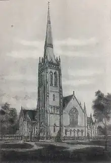 The tower also incorporated a door in its base facing onto Argyle Park Terrace. A contemporary report in The Builder noted the design's quatrefoil parapet for the tower imitated the parapet of the tower of St Giles'.[57] In addition to the spire, a flèche crowned the crest of the southern part of the roof. The south gable featured a large window with curvilinear tracery and was capped by a tall pinnacle. To the west of the south gable was a two-storey porch with a door giving access to the Meadows.[48]