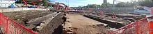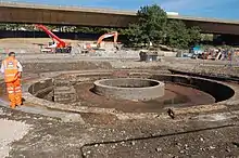 Royal Oak, another station on the Hammersmith & City line, was also once served by the GWR, but its services were withdrawn in 1934.[14] Today, the first stop out of Paddington is at Acton Main Line. Industrial archaeologists have found the remains of buildings including a broad gauge train shed for Brunel's original lines, a turntable, and engine sheds in excavations east of the station as part of the land clearance work for the Crossrail project.[15]