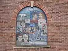 Two visitor information signs, on the hill above the horse and in the Viewing Area car park, were placed in 1999 following the completion of Devizes White Horse; the signs show all eight Wiltshire White Horses. Also on the side of the hill is a toposcope dated 1968, mounted on a small stone structure, which identifies the towns and cities that can be seen from the hillside.[13] For the Golden Jubilee of Queen Elizabeth II, a fire beacon was placed to the side of the road on the top of the hill leading to the car park on 3 June 2002,[14] that resembles the millennium beacons.[15] It is lit sporadically, and was lit for the 70th anniversary of VE Day on 8 May 2015.[16]