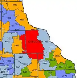 The district's territory includes all of the western half of Dubuque County, eastern parts of Delaware County, northeastern Jones County, northwestern Jackson County and extreme southeastern Clayton County. This area includes the towns of: Balltown, Bankston, Bernard, Cascade, Centralia, Dyersville, Epworth, Farley, Luxemburg, Holy Cross, New Vienna, Peosta, almost all of Rickardsville, and Worthington. All are completely or partially in Dubuque County.[7] It also serves the unincorporated areas of Fillmore,[8] Petersburg,[9] and Temple Hill.[8]