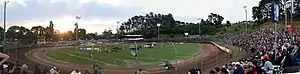 Western Springs Stadium was built on land purchased from the Motion family by Auckland City Council in 1875 in order to build the Western Springs reservoir and pump station.[1] Situated in a natural amphitheatre, concrete terracing was constructed. It was designed and modelled on European stadiums which included a banked concrete cycling track, a cinder running track, and a grassed centre area for football and sports. The original design included a covered grandstand which would fill the gap between the concrete terraces, the cycling track finishing straight was designed and built to start and finish in front of the proposed grandstand (where the pit area now is). The stadium was never completed.