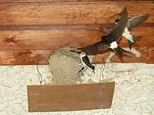 Breeding birds return to Europe between April and May, and nest building starts between late March in North Africa and mid-June in Lapland. The nest is a neat closed convex cup fixed below a suitable ledge, with a narrow opening at the top. It is constructed by both sexes with mud pellets collected in their beaks, and lined with grasses, hair or other soft materials. The mud, added in successive layers, is collected from ponds, streams or puddles.[9] House sparrows frequently attempt to take over the nest during construction, with the house martins rebuilding elsewhere if they are successful. The entrance at the top of the cup is so small once it is complete that sparrows cannot take over the nest.[22]