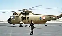 One of the most extensively modified variants was the Westland Commando, operated by the Royal Navy as the HC4.[12][13] The Commando had capacity for up to 28 fully equipped troops and had originally been developed to meet an Egyptian Air Force requirement.[14] Due to the deletion of the amphibious capability, not required in the Egyptian desert, the most noticeable change from the Sea King was the deletion of the side floats, the main undercarriage being carried on stub sponsons. An improved variant of the Egyptian Commando, with changes including the fitting of folding blades common to the ASW variants, was designated as the Sea King HC4 by the Royal Navy and all the aircraft were new build. First flying on 26 September 1979, due to its operational range of up to 600 nautical miles without refuelling, the HC4 'Commando' became an important asset for amphibious warfare and troop transport duties, in particular.[14][15] Several Royal Naval Air Squadrons have operated the Commando variant, such as 845 Naval Air Squadron, 846 Naval Air Squadron and 848 Naval Air Squadron. In British service, the Sea King HC4 was deployed on operations in the Falklands, the Balkans, both Gulf Wars, Sierra Leone, Lebanon and Afghanistan. Towards the end of the Sea King's operational life, several HAS6s were repurposed by the removal of the ASW equipment, as troop transports. In 2010, the last of the UK's converted ASW Sea Kings to troop transports were retired.[16]