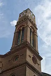 The present chapel, completed in 1865, was designed by the architect William Ford Poulton (1822–1901) of Reading, Berkshire in a Lombard Romanesque Revival style. It is built of stock brick with some red brick and stone dressings. The façade on Buckingham Gate is gabled and has a recessed triple-arched central porch, with graduated arcading above, all having decorative shafting. There is a tower to the right, with coupled arched windows. The top stage of the tower was added in the 20th century in a different style and colour.
