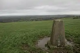 The summit is marked by a trig point just north of the A 356, and there is a transmission mast about 100 metres to the northwest. To the east the terrain drops steeply towards Corscombe. To the southwest it descends gently to Beaminster Down before dropping sharply at Mintern's Hill towards Beaminster.[1]