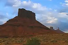 For the series' large-scale exterior look, the producers drew inspiration from the work of John Ford, who shot four of his Western films in Castle Valley, east of Moab.[82] In early 2014, Nolan visited southern Utah with key crew members and a location scout to explore the possibility of filming there, and promptly fell in love with the place.[81] Location shooting for the pilot episode later occurred over five days in southern Utah,[81] including Castle Valley.[82] Most Utah locations, like Dead Horse Point State Park, were "walk-in" areas where both cast and crew were required to hike in and out with all their gear.[81] Horseback riding scenes were filmed at a private ranch, where the filmmakers were not subject to as many restrictions as when working on public land.[85] To seamlessly blend California sets with Utah scenery, set walls were shipped to Utah so that they could be used to film reverse angles of scenes originally filmed in California.[85] For example, conversations on the exterior balcony of Westworld's operations center were shot on a balcony at the Skirball Center facing towards the center, then reverse angles over the shoulders of the cast members were shot at Dead Horse Point, to make it seem as if the operations center was located on top of the state park's steep cliffs.[76][81][85] The train interior scenes were created by mounting the entire train car set on the back of a flatbed truck and driving the truck back and forth along Utah State Route 128.[81]