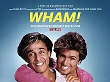 Wham! is a 2023 documentary film about the English pop duo Wham! consisting of George Michael and Andrew Ridgeley. The film marks the 40th anniversary of their 1983 debut album Fantastic. Directed by Chris Smith it relies primarily on rare archive footage and audio interviews by the duo, including television appearances, concert footage, private home video, behind-the-scenes outtakes, and family comments all linked together using scrapbooks created by Ridgeley's mother.[4] The film was co-produced by Ventureland / Passion Pictures, Nemperor Production, and Library Films with Altitude Film and Netflix serving as distributors.[1][5][6]