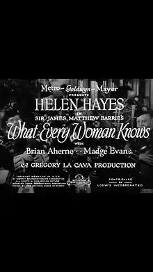 What Every Woman Knows is a 1934 American romantic comedy film directed by Gregory La Cava and starring Helen Hayes, Brian Aherne and Madge Evans.[2] The film was produced and distributed by Metro-Goldwyn-Mayer and is based on the play What Every Woman Knows (1908) by J. M. Barrie. It was filmed by Paramount back in the silent era in 1921 and stars Lois Wilson. An even earlier British silent version was filmed in 1917. Hayes was familiar with the material as she had starred in a 1926 Broadway revival opposite Kenneth MacKenna.[3][4]