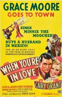 When You're in Love is a 1937 American musical film directed by Robert Riskin and Harry Lachman, who was not credited, and starring Grace Moore and Cary Grant. Moore sings "Minnie the Moocher" and the Ernesto Lecuona classic Cuban song "Siboney". Two of the other songs in the film – "Our Song" and "The Whistling Boy" – are by Jerome Kern and Dorothy Fields.