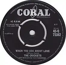 "When You Ask About Love" was the second single from the Crickets' second album, In Style With the Crickets. It was also the second single to be released after the death of Buddy Holly. The song was written by guitarist Sonny Curtis and drummer Jerry Allison whilst they were at the home of Allison's girlfriend and future wife, Peggy Sue Gerron (after whom the Buddy Holly song is named). The B-side "Deborah" was named after Peggy Sue's younger niece.[2]
