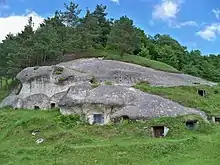 To the Croats are attributed two Gords of unusually big dimensions and each of them could inhabit tens of thousands of people – Plisnesk with a surface of 450 ha, including a fortress with a pagan center, surrounded by seven long and complex lines of protection, several smaller settlements in the near vicinity, more than 142 burial mounds with both cremation and inhumation partly belonging to warriors and else,[380][381][382] located near village Pidhirtsi and since 2015 regionally protected as a Historic and Cultural Reserve "Ancient Plisnesk";[383] and Stilsko with a surface of 250 ha, including a fortress of 15 ha, defensive line of 10 km,[384][385] located on river Kolodnitsa (used for navigation of ships as was connected to most important river in the region, Dniester[386][387]) between current village Stilsko and Lviv.[65][388] In the vicinity of Stilsko were also found some of the only examples of a pre-Christian period cult building among Slavs,[389][390] for one of which Korčinskij assumed a possible connection with the medieval descriptions of a temple dedicated to the deity Khors.[65][391] Until 2008 near Stilsko have been found more than 50 settlements of open type dated between 8th–10th century,[392] as well around 200 burial mounds.[393][387]