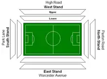 The outer White Hart Lane frame was designed in a rectangular shape, with the inner seating tiers being rounded to maximise the number of seats possible within the structure. The cockerel was placed upon the West Stand, with the West Stand located on Tottenham High Road, the East Stand being on Worcester Avenue, the North Stand on Paxton Road and the South Stand on Park Lane. The stands were officially named after compass points, but were more colloquially referred to by the road onto which they back.[66]