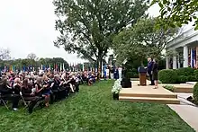 On September 26, 2020, an event was held in the White House Rose Garden announcing Amy Coney Barrett's nomination to the Supreme Court following the death of Ruth Bader Ginsburg.[55] More than 150 people attended; they were told they did not need to wear masks if they had tested negative that day. Chairs for the outdoor ceremony were placed side by side, and there were two crowded indoor receptions.[50][56] At least seven attendees tested positive for SARS-CoV-2 in the following week, including[57] President Trump, First Lady Melania Trump, Senators Mike Lee and Thom Tillis, University of Notre Dame president John I. Jenkins, former Counselor to the President Kellyanne Conway, and former New Jersey Governor Chris Christie.[58][59] Barrett had suffered infection in the summer before recovering and testing negative.[60][61] Michael D. Shear, a White House correspondent for The New York Times, first tested positive for the virus October 2, as did many others. He was not present at the Rose Garden event, but had visited the White House on September 27 for a COVID-19 test, required before traveling with the President to a rally in Pennsylvania.[62]