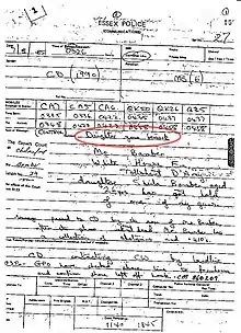 Michael Bonnett, a civilian dispatcher in Chelmsford police station's information room, began a "radio log" which kept track of messages about the situation. The radio log discusses a telephone call made at 3:26 am on 7 August.[98] According to the prosecution, this is the telephone call known to have been made by Jeremy, the same call that is entered in the event log.[93] According to the defence, the radio log is not simply a duplicate log of Jeremy's call but a log of a separate call to the police by Nevill.[99]