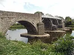Another Act of Parliament was passed in 1796, allowing the crossing to be partially rebuilt in 1797 to a different design that used stone and wood. The central three bays were at this time replaced with a wood decking and superstructure. This beam and trestle design comprising three spans is how the bridge appears today. The two outer spans are buttressed masonry archways of sandstone and ashlar; the central wooden section has two double pontoons to support it.[2][3][4]