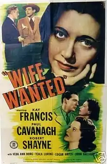 Wife Wanted is a 1946 American crime drama film directed by Phil Karlson and starring Kay Francis in her last film role, Paul Cavanagh, and Robert Shayne. The film's screenplay was written by Caryl Coleman and Sidney Sutherland, based on the novel Wife Wanted by Robert E. Callahan.[1]