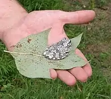 Frogs are common in the marshy and wet regions of the Piedmont. The frog pictured at left is a Cope's gray treefrog (Hyla chrysocelis) or gray treefrog (H. versicolor). These two species cannot be differentiated except by their call or genetic analysis. However, H. versicolor is rare in the state and likely to not be pictured here. They are most abundant in some northern Piedmont counties. Other frogs of North Carolina include spring peepers, Pseudacris crucifer or Hyla crucifer. Common among Carolina forests, this frog lives in high branches of trees, although it is also seen on the ground and commonly on roadways.