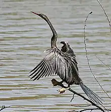 Darters are often called "snake-birds" because of their long thin neck, which gives a snake-like appearance when they swim with their bodies submerged. The males have black and dark-brown plumage, an erectile crest on the nape and a larger bill than the female. The females have much paler plumage especially on the neck and underparts. The darters have completely webbed feet and their legs are short and set far back on the body. Their plumage is somewhat permeable, like that of cormorants, and they spread their wings to dry after diving. There are 4 species worldwide and 1 species which occurs in Thailand, the Oriental darter (Anhinga melanogaster). This near threatened species was sighted in Phitsanulok in 2006 and 2007.[6][8]