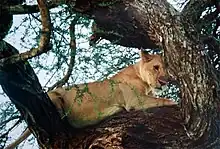 Tree-climbing lion (Panthera leo) in Tarangire National Park