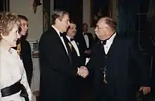 Brimley supported advertisements to have Utah allow horse-race gambling.[35] He spoke against the banning of cockfighting in New Mexico on the basis of his support of individual rights.[36] He also spoke at a 1998 Phoenix rally opposing an Arizona ballot proposition to ban cockfighting, arguing that a ban could lead to efforts to restrict the use of hunting dogs, which opponents of cockfighting called a distraction from the issue.[37] Brimley enjoyed playing poker[38] and played in the World Series of Poker Main Event.[39]