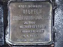 Wilhelm "Willy" Schürmann-Horster (21 June 1900 – 9 September 1943) was a German actor, dramaturge, and director, who was a marxist and dedicated communist,[1] and who became a resistance fighter against the Nazis.[2][3] As a young man, Schürmann-Horster trained as an actor at the Düsseldorf Drama School. During the 1920s he worked in various acting troupes in theatres in the Rhineland. By the mid 1930s, he had become a communist and in 1934 and 1935 he was arrested for political agitation but acquitted for lack of evidence. After moving to Berlin in 1937, he met and became friends with Cay and Erika von Brockdorff. Through them, a discussion group of like-minded friends was formed who openly discussed current affairs[4] and Schürmann-Horster became their spokesman. Through contacts in the group, connections were made with a resistance organisations that was run by Harro Schulze-Boysen and Arvid Harnack in 1940. Although Schürmann-Horster wasn't a physical resistance fighter in the cast of Harro Schulze-Boysen, he was an intellectual opponent of the Nazis who displayed his convictions on the stage and as a result never took part in any of the operations that his friends undertook. After falling ill in 1941, Schürmann-Horster moved to Konstanz where he worked as a dramaturge at the Grenzland Theatre. In October 1942, he was arrested and sentenced to death for "high treason", "dissemination of illegal writings" and "aiding and abetting the enemy" by the 2nd of the Volksgerichtshof.[5] He was executed in Plötzensee Prison on 9 September 1943.[6] He was described by his close friend, the communist trade unionist Rudy Goguel in the daily newspaper Südkurier as