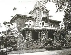 In 1867, Wilkins married Harriet Dawkins Cleveland (1843–1930) of Greenville, a woman wealthy in her own right; and in 1875 they settled in her hometown. On 93 acres Wilkins built a two-story brick mansion in the Italianate style, reflecting their prominence in the business and social life of the community. An 1898 publication described the house as "the finest home of any man in northern South Carolina."[4] The elegant interior, decorated in high Victorian style, included large crystal chandeliers, bas-relief carvings, and an impressive curved staircase. A conservatory on the north side was crowded with plants and flowers.[5] Even after the death of her husband and only son, Mrs. Wilkins (thereafter always dressed in black) continued to play the grand lady, hosting luxurious dinner parties and being driven to social appointments in an enclosed carriage.[6]