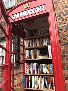 A K6 telephone box in Wistaston Road has been in place since the late 1940s. Decommissioned by British Telecom in 2010, it was then purchased by Willaston Parish Council and turned into a book exchange, the 'book box'. A restoration was carried out in September 2019.