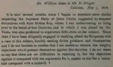 Adam was born in Dunfermline in Scotland, and it was after being inspired by the churchman Thomas Chalmers that he decided to go to India. He arranged to be educated at the Baptist College in Bristol and to the University of Glasgow. Adam volunteered to become a missionary and by 1818 he was working hard north of Calcutta trying to master Sanskrit and Bengali. Having learned these he was engaged in creating a translation of the new testament in Bengali. He worked with Ram Mohan Roy and he supported Roy's insight into the translation.[1]