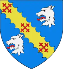![]() Arms of Cowper: Azure, on a bend engrailed, Or, between two wolf's heads erased, Argent, three cross crosslets, Gules[1] | |