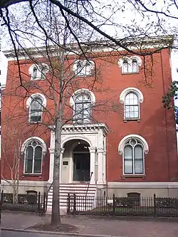 The William H. Grant House, also known as Sheltering Arms Hospital, is a historic house located in Richmond, Virginia. It was built in 1857, and is a large, three-story brick townhouse in the Italianate style. It features a small, richly ornamented arched front porch supported by coupled square columns. In 1892, the house was acquired by the Sheltering Arms Hospital, who occupied it until 1965. It is connected to the Benjamin Watkins Leigh House.[3]