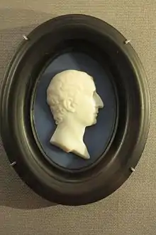 When Hamilton returned to England for a third period of leave, in 1783–84, he brought with him a Roman glass vase, which had once belonged to the Barberini family and which later became known as the Portland Vase. Hamilton had bought it from a dealer and sold it to the Duchess of Portland with the help of his niece Mary Hamilton, who was the duchess's literary friend. The cameo work on the vase again served as inspiration to Josiah Wedgwood, this time for his jasperware. The vase was eventually bought by the British Museum.[17] He was elected a Foreign Honorary Member of the American Academy of Arts and Sciences in 1792.[18]