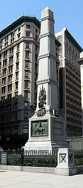Worth's remains were originally deposited in Green-Wood Cemetery where they sat unburied for four years. In January 1855, a committee was established to design a suitable monument for General Worth. The monument was designed and built by James G. Batterson in 1857.[7] On November 25, 1857, Worth's remains were reinterred in the 51-foot granite monument on Worth Square on a traffic island between Fifth Avenue and Broadway at 25th Street in New York City's borough of Manhattan.[8] The Worth Monument is the second oldest monument in New York.