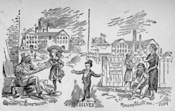 The question of the currency had been a major political issue since the mid-1870s. Advocates of free silver (or bimetallism) wanted the government to accept all silver bullion presented to it and to return it, struck into coin, at the historic value ratio between gold and silver of 16 to 1. This would restore a practice abolished in 1873. A free silver policy would inflate the currency, as the silver in a dollar coin was worth just over half the face value. Someone who presented ten dollars in silver bullion would receive back almost twice that in silver coin.[12] Advocates believed these proposals would lead to prosperity, while opponents warned that varying from the gold standard (which the United States had, effectively, used since 1873) would cause problems in international trade.