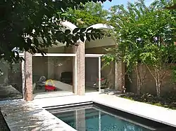 The house is 2,600 square feet with a poured-in-place concrete roof consisting of three 13-foot high arched vaults.[4] The front and rear elevations of the house are glass, resulting in a largely transparent house. The side walls are pale red brick.[1]