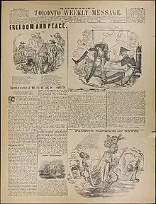 Mackenzie and his wife arrived in New York City and launched Mackenzie's Gazette on May 12, 1838, after soliciting subscriptions from friends.[131] Its early editions supported the Patriots and focused on Canadian topics, but pivoted to American politics in August 1838.[132][133] He suspended publication of his paper in the fall of 1838 and moved to Rochester to rebuild the Patriot forces by creating the Canadian Association.[134] The association struggled to attract Canadian members and unsuccessfully fundraised for Mackenzie to publish an account of the Upper Canada Rebellion. The money was reallocated to Mackenzie's defence fund for his upcoming trial.[135] He restarted Mackenzie's Gazette in Rochester on February 23, 1839.[136]