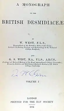 After that, West collaborated with his son George Stephen West on publications on the subject of phycology, especially freshwater algae.[12] "The two Wests became experts in this field – their studies leading to A Monograph of the British Desmidiaceae".[5] The first volume of that series was promptly purchased in October 1904 by Thomas W. Hand, city librarian for Leeds Public Free Libraries, and catalogued as no. 589.61.[20] W. Denison Roebuck commented:[10]