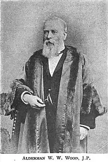 William Willis Wood[1][2][3] was born in Bradford in 1832. He attended Bradford Moor Sunday and Day School to the age of 11 when he started work in a local factory. He undertook further studies at the Bradford Mechanics' Institute. He continued to champion access to education throughout his life, supporting the Old Bradford Sunday School and serving as a secretary of the Mechanics institute. He became a co-owner of Junction Mills (worsted spinner) at Laisterdyke.[4] Wood was elected councillor for Bradford Moor Ward in 1877 and served until November 1883. In 1883 he was elected alderman and served until November 1907. In November 1894, he was elected Mayor of Bradford and served until November 1896. Wood represented Bradford City Council on the Board of Bradford Grammar School. He resided at Greenhill House on Leeds Road in Bradford in what is now Saint Peter's Presbytery.[5][6] He died in 1905 and is buried in Bowling Cemetery in Bradford.[7] Wood Was succeeded in office by Thomas Speight (1844–1921), who was Mayor of Bradford from 1896 to 1898.
