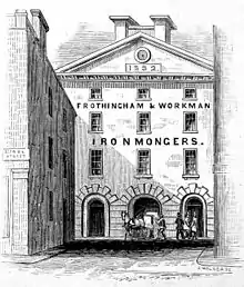 William Workman's first employment was working on the newspapers, Canadian Courant and Montreal Advertiser, owned by his brother, Benjamin. In 1830, he joined another brother, Thomas, in the wholesale hardware house of John Frothingham. By 1836, the Workmans had become full partners, indicating that they had brought some capital into the firm. As well as handling imported items, Frothingham and Workman manufactured some hardware in their Montreal factories which employed hundreds of men. Workman would remain in partnership with Frothingham until his retirement in 1859, and under them it would become Canada's largest tool and hardware wholesale business.[3]