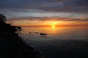 Sunset Island is not an island but actually two islands connected by a narrow spit of land. This spit, between the smaller western island and its larger sister to the east, has on occasion been washed away by lake storms isolating East Sunset Island. The western smaller island is connected to the mainland and accessible through Tuscarora State Park by a path, hence boat access is the primary means of access. In recent times, some lakeside homes had to be moved inward because of erosion. In the late 1800s and early 1900s there were some hotels on the island which have long since been lost to fire, storms and time".[4]