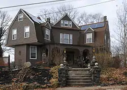 Windsor Hills Historic District is a national historic district in Baltimore, Maryland, United States. It is a cohesive residential suburb defined by rolling topography, winding, picturesque streets, stone garden walls, walks and private alley ways, early-20th century garden apartments, duplexes, and freestanding residences. Structures are predominantly of frame construction with locally quarried stone foundations. Windsor Hills developed over a period from about 1895 through 1929. The dominant styles include Shingle cottages, Dutch Colonial Revival houses, Foursquares, and Craftsman Bungalows.[2]