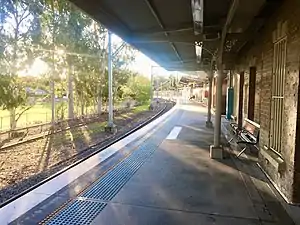 A skillion roof and timber clad signal box constructed c. 1916 behind the Up end of the platform is no longer extant. A timber and gable roofed ex-goods shed on the Down side of the track beyond the Down end of the platform was extant in 2001 but is no longer extant.[2]