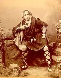 A rare etching of the interior of the theatre at this time depicts a production by Laura Keene in her theatre; From the point of view of the stage, it depicts what is probably the production of a classical text, with two figures in historical costumes standing downstage close to the footlights.[13] This etching, from the actors' point of view, gives a rare glimpse into theatrical production on the American stage in the pre-Civil War era.