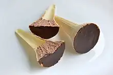 Winter ice cream (Hungarian: téli fagylalt [ˈteːli ˈfɒɟlɒlt] or téli fagyi [ˈteːli ˈfɒɟi]) is a Hungarian confectionery similar in appearance to ice cream in a cone, but traditionally having ganache or a similar kind of sweet cream filling with usually a chocolate-cocoa flavoring.[1][2] It gained popularity in the 1970s in communist Hungary,[3] being produced as a winter alternative to "summer" ice creams, which were deemed to be too cold for winter sweets.[2] Apart from grocery shops, it was frequently sold as part of the national railway's catering service (utasellátó).[3] The confectionery's popularity faded in the early 1990s, when, after the end of communism, foreign candy manufacturers and their products appeared on the Hungarian market.[3] However, along with some other snack foods and soft drinks of communist-era Hungary, winter ice cream garnered renewed interest in the late 2000s and 2010s.[4][3][5]