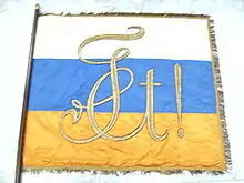 The flag of Unitas Stolzenfels shows the colours white-blue-gold in horizontal stripes. Embroidered on them is the Monogram. On the other side the coat of arms is depicted on a blue basis. Underneath it reads: „Unitas Stolzenfels sei's panier“ (Flag of Unitas Stolzenfels)
