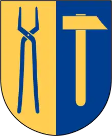 During the Middle Ages, he became the son of Wayland the Smith and Böðvildr, and this entitled him to carry a hammer and tongs in his coat of arms.[1] Later the origin of his name "Wayland's son" was forgotten, but the fame of the character prevailed.[1] During the 16th and the 17th centuries, this led to the idea that his name "Villandsson" referred to Villand Hundred in Skåne, and the hundred duly began to use his coat of arms as its own.[1] Wudga wielded the sword Mimung, forged by his father, as was the helmet he wore. His mount was the stallion Schimming, one of the finest horses of its age.